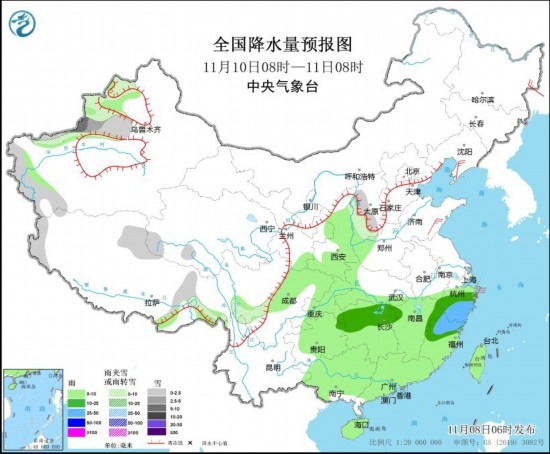 11月10日08時(shí)至11日08時(shí),新疆沿天山地區(qū)和南疆西部山區(qū)、山西中部等地部分地區(qū)有小到中雪或雨夾雪,局地大雪。西北地區(qū)東南部、江漢西部、江南、西南地區(qū)東部、華南、臺灣島等地部分地區(qū)有小到中雨,其中,浙江中南部、福建北部等地部分地區(qū)有大雨。遼東半島、山東南部等地部分地區(qū)有4~5級風(fēng)(見圖4)。