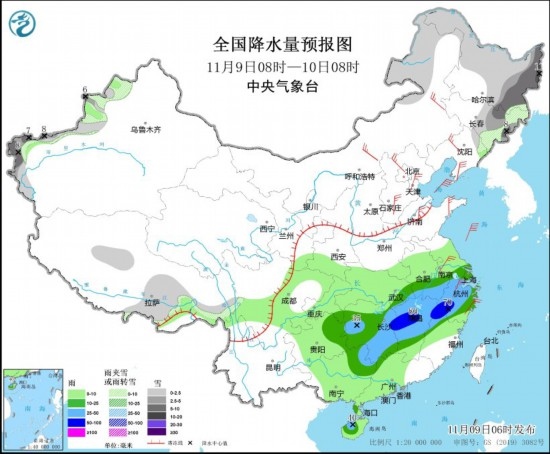 11月9日08時(shí)至10日08時(shí),新疆西部、內(nèi)蒙古東北部、黑龍江大部、吉林中東部、遼寧東北部等地部分地區(qū)有小到中雪或雨夾雪,其中,黑龍江東部、吉林東部、新疆南疆西部山區(qū)等地部分地區(qū)有大雪,局地暴雪。重慶東南部、貴州東部、湖北東部、湖南大部、蘇皖南部、上海、江西中北部、浙江大部、福建西北部以及廣西東北部等地部分地區(qū)有中到大雨,其中,江西西部和東北部、浙江西南部、福建西北部等地部分地區(qū)有暴雨(50~80毫米)。內(nèi)蒙古中東部、遼寧大部、華北東部和北部、黃淮北部、江南東部等地部分地區(qū)有4~6級(jí)風(fēng)(見圖3)。