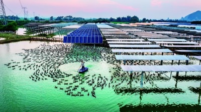 在廣西壯族自治區(qū)南寧市上林縣白圩鎮(zhèn)登山村,養(yǎng)殖戶在光伏板旁給鴨子喂食。“漁光互補(bǔ)”拓寬了當(dāng)?shù)刂赂辉鍪盏那?。潘永攝