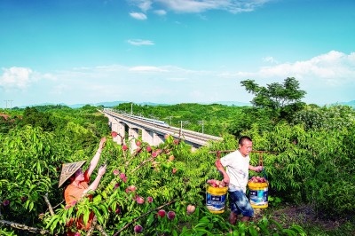 湖南省芷江侗族自治縣的果農(nóng)在鐵路橋附近摘桃子。高鐵的建設(shè)開通對沿線群眾發(fā)展產(chǎn)業(yè)有著積極作用。李小平攝