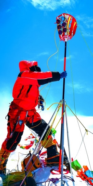 “2020珠峰高程測量登山隊(duì)”成功登頂世界第一高峰珠穆朗瑪峰,隊(duì)員在峰頂開展測量工作。扎西次仁攝