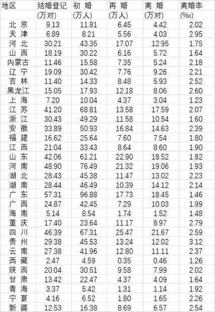 表:2022年31個(gè)省份結(jié)婚登記、初婚、再婚、離婚及離婚率數(shù)據(jù)(數(shù)據(jù)來源:《中國統(tǒng)計(jì)年鑒2023》)