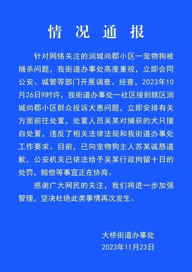 ·安徽安慶通報“寵物犬被捕狗隊抓走后送往市場宰殺”:處置人員被行拘10日。