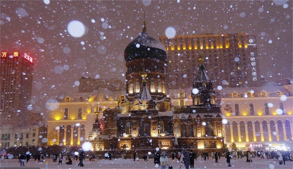 哈爾濱出現(xiàn)暴雪天氣,索菲亞教堂雪中如夢如幻。
