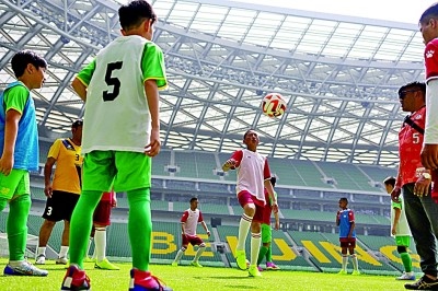 來自青海玉樹的40名藏族青少年參加“青海玉樹藏族青少年北京行”公益活動(dòng),與國(guó)安少年足球隊(duì)交流。新華社發(fā)