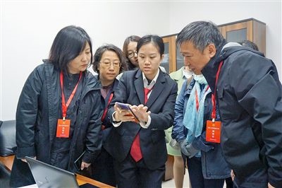 最高人民法院第五巡回法庭干警為代表演示群眾來信一鍵回復(fù)。