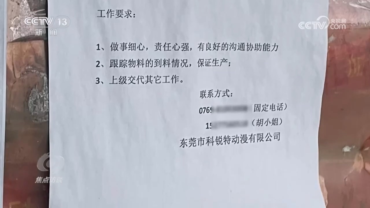 隨后,記者在佳輝公司的門口看到了幾張招工啟示,其中一張的招工單位落款正是科銳特公司,看來(lái),兩家公司必定有所關(guān)聯(lián)。于是,記者想辦法再次進(jìn)入到了“佳輝”的生產(chǎn)車間,發(fā)現(xiàn)工人們正在生產(chǎn)所謂的“美少女”手辦的組合部件。