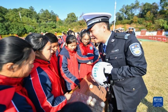 12月1日,在長沙市望城區(qū)新河學(xué)校,學(xué)生觀看交警手勢演示。