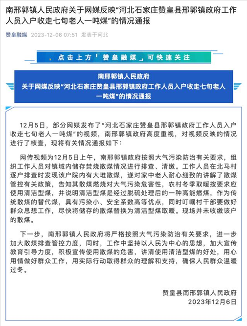 ·河北石家莊贊皇一工作人員入戶收走7旬老人一噸過冬煤?官方:現(xiàn)場(chǎng)未收繳。