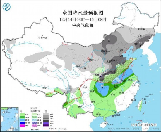 12月14日08時(shí)至15日08時(shí),西北地區(qū)中東部、內(nèi)蒙古中西部和東南部、吉林、遼寧、華北、黃淮大部、江淮西部、湖北北部等地部分地區(qū)有小到中雪或雨夾雪,其中,內(nèi)蒙古中部、吉林東南部、遼寧東部、陜西東南部、湖北西北部、河南大部、安徽北部、山東中西部、河北南部等地部分地區(qū)有大到暴雪,陜西秦嶺東部、湖北西北部、河南西部山區(qū)等地局地有大暴雪或特大暴雪(30~35毫米)。江淮東部、江漢大部、江南北部和西部、重慶等地部分地區(qū)有中到大雨。內(nèi)蒙古西部、甘肅河西等地部分地區(qū)有4~6級(jí)風(fēng)。