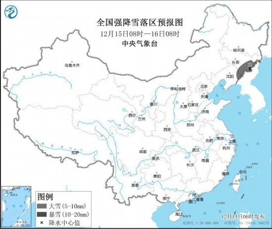 12月15日08時(shí)至12月16日08時(shí),吉林東部、遼寧東北部等地部分地區(qū)有大雪,其中,吉林東部長(zhǎng)白山地區(qū)局地有暴雪(10~11毫米)。上述部分地區(qū)新增積雪深度3~8厘米,局地可達(dá)10厘米以上。