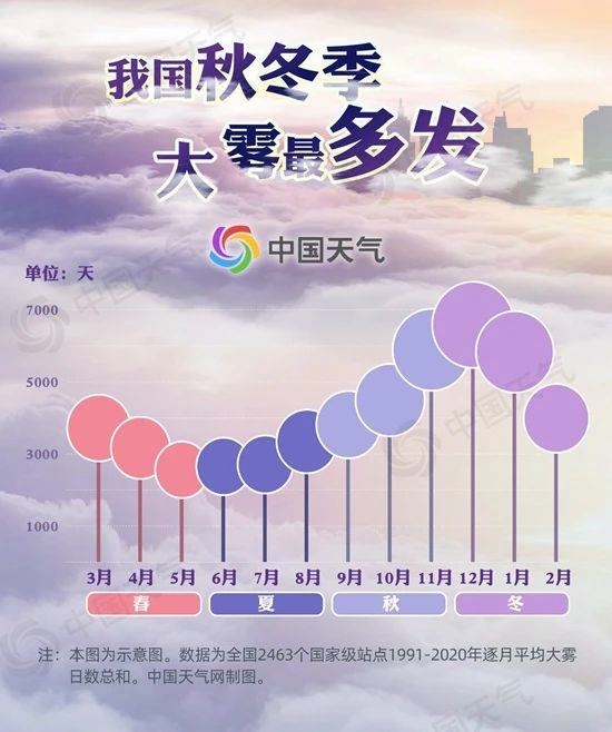 從逐月數(shù)據(jù)來(lái)看,常年我國(guó)大霧日數(shù)最多的月份是12月,其次是11月和1月,最少的月份是5月。這是因?yàn)槲覈?guó)內(nèi)陸地區(qū)的大霧種類主要是輻射霧。秋冬季節(jié),夜晚較長(zhǎng)、氣溫較低,夜間地面輻射冷卻,容易使地面大氣中水汽凝結(jié),從而形成輻射霧。