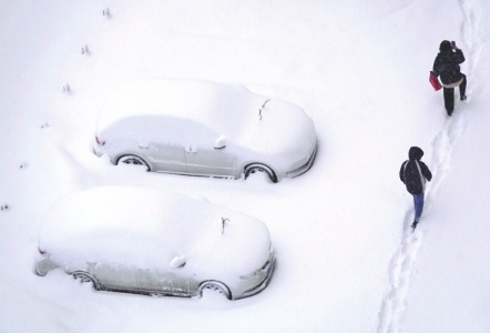 煙臺街頭,市民從被冰雪覆蓋的車輛旁經過。