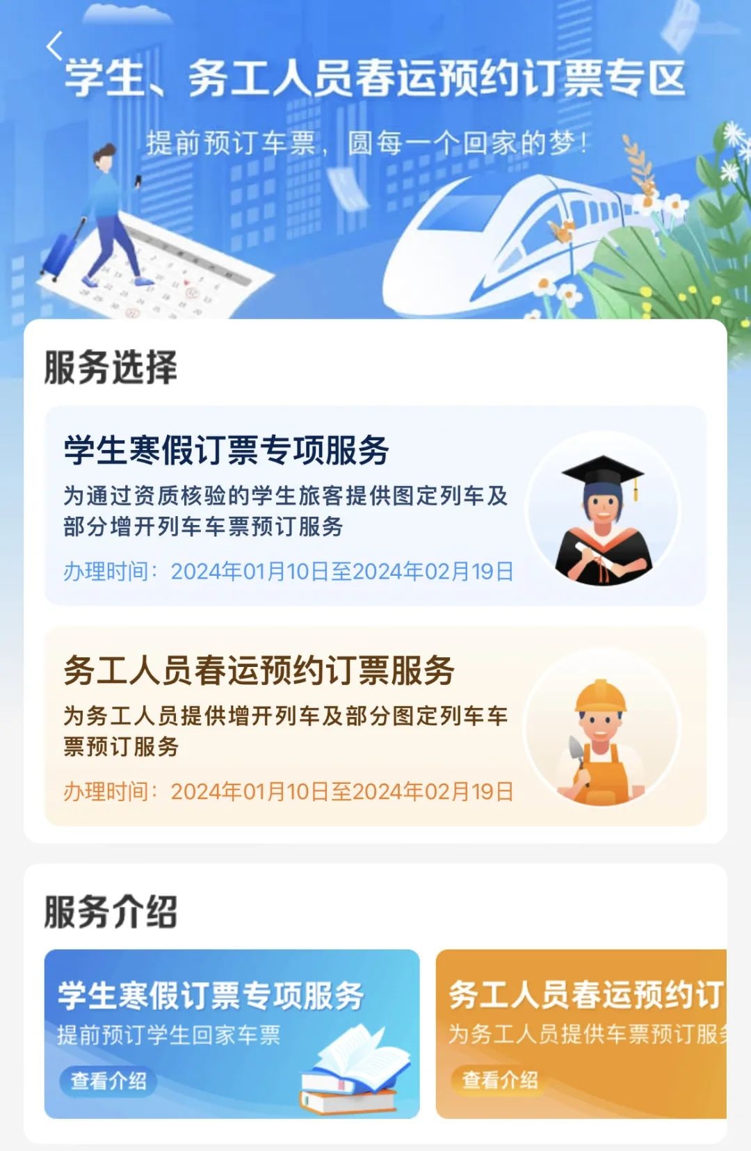 為認(rèn)真貫徹落實(shí)黨中央國(guó)務(wù)院關(guān)于做好2024年元旦春節(jié)期間有關(guān)工作的要求,保障學(xué)生、務(wù)工人員等重點(diǎn)群體春運(yùn)出行,鐵路12306創(chuàng)新服務(wù)舉措,為學(xué)生、務(wù)工人員推出了售票服務(wù)專區(qū)。自1月10日起,符合條件的學(xué)生旅客(已通過(guò)學(xué)生優(yōu)惠資質(zhì)核驗(yàn)且有剩余優(yōu)惠乘車次數(shù))可通過(guò)“學(xué)生寒假訂票專項(xiàng)服務(wù)”專區(qū)預(yù)約購(gòu)買春運(yùn)期間(1月26日至3月5日)火車票,每名旅客最多可同時(shí)提交6個(gè)預(yù)約訂單,每個(gè)訂單可添加1個(gè)乘車日期的20個(gè)“車次+席別”的組合,可選席別為學(xué)生優(yōu)惠票適用的硬座、硬臥、二等座。已通過(guò)實(shí)名制核驗(yàn)的務(wù)工人員可通過(guò)“務(wù)工人員春運(yùn)預(yù)約訂票服務(wù)”專區(qū)預(yù)約購(gòu)買春運(yùn)期間火車票,每名旅客可同時(shí)提交6個(gè)預(yù)約訂單,每個(gè)訂單可選擇“時(shí)間+車次+席別”的1個(gè)組合。