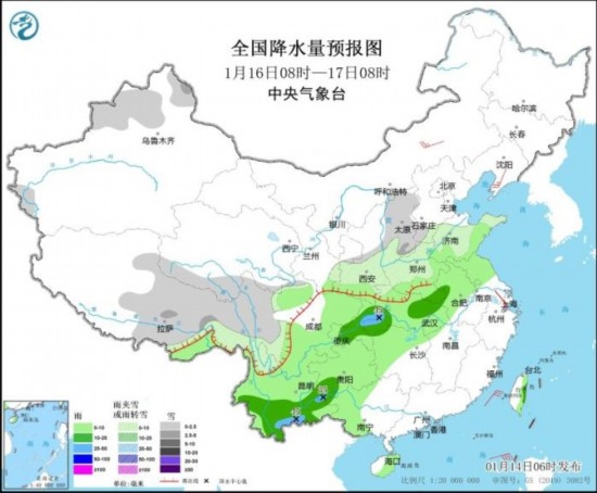 1月16日08時(shí)至17日08時(shí),新疆北部、西藏中東部、青海南部、陜西中北部、華北南部和西部、黃淮西部和北部、川西高原、云南西北部等地部分地區(qū)有小到中雪或雨夾雪。黃淮南部、江淮大部、江漢、湖南西部和北部、西南地區(qū)大部、廣西西部等地部分地區(qū)有小到中雨,其中,湖北西南部、重慶東北部、云南南部等地局地有大雨(25~45毫米)。內(nèi)蒙古中部、遼東半島等地部分地區(qū)有4~5級(jí)風(fēng)。南海中北部海域?qū)⒂?~7級(jí)風(fēng)、陣風(fēng)8~9級(jí)。