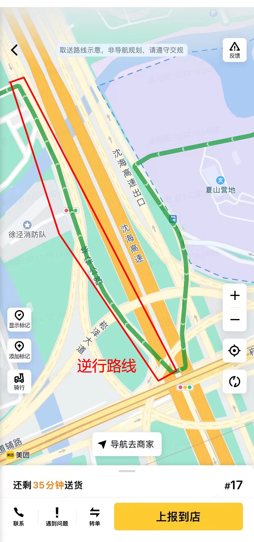 高架路或者高速的輔道是平臺規(guī)劃逆行路線的高發(fā)地。陳陽陽提供的另一送餐路線為從蟠龍?zhí)斓厮屯⒏駝?chuàng)意園,平臺規(guī)劃的路線中,包含了一大段沿著沈海高速西側(cè)的華徐公路輔道由南向北騎行的逆行路線。事實上,這段輔道只能由北向南騎行。記者再用其他導航軟件規(guī)劃騎行路線,給出的騎行路線需要從西側(cè)的明珠路繞行。兩者相比,繞行路線總長為3公里,而美團平臺規(guī)劃的逆行路線僅1.4公里,節(jié)約了超過一半的路程。