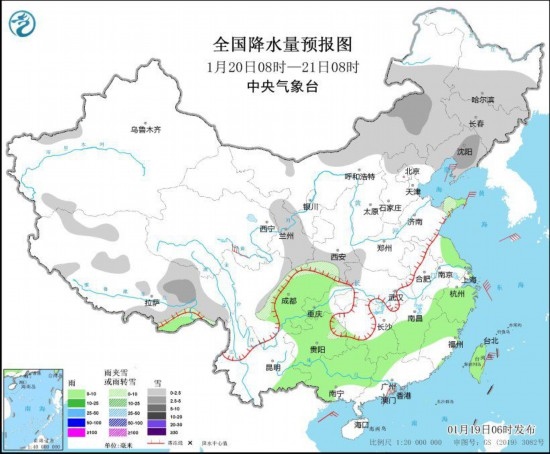 1月19日08時(shí)至20日08時(shí),內(nèi)蒙古中部、遼寧西部、新疆沿天山地區(qū)、甘肅河西、陜西北部和南部、山西、河南西部、山東東部、安徽北部、湖北北部等地部分地區(qū)有小雪或雨夾雪,其中,內(nèi)蒙古中部、陜西北部、河北北部等地部分地區(qū)有中到大雪(5~9毫米)。江淮西部、江南大部、西南地區(qū)東南部、華南北部等地部分地區(qū)有中到大雨,其中,廣西北部等地局地有暴雨(50~65毫米)。內(nèi)蒙古中西部、江蘇北部部分地區(qū)有4~6級(jí)風(fēng)。渤海、黃海大部、臺(tái)灣海峽將先后有6~7級(jí)、陣風(fēng)8級(jí)的東北到偏北風(fēng)(見(jiàn)圖1)。