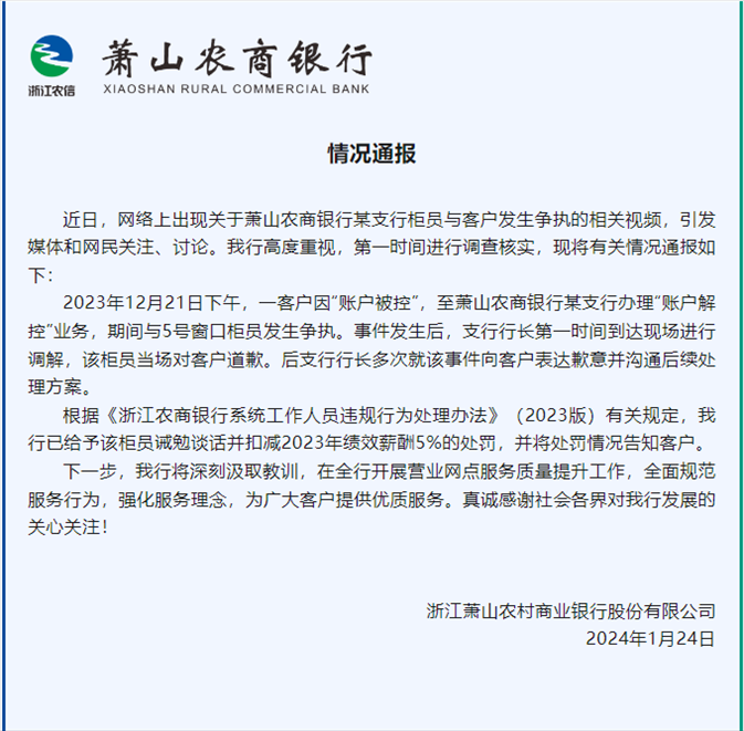 ·杭州蕭山農(nóng)商銀行柜員對客戶大吼“滾”,銀行回應:扣減5%績效。