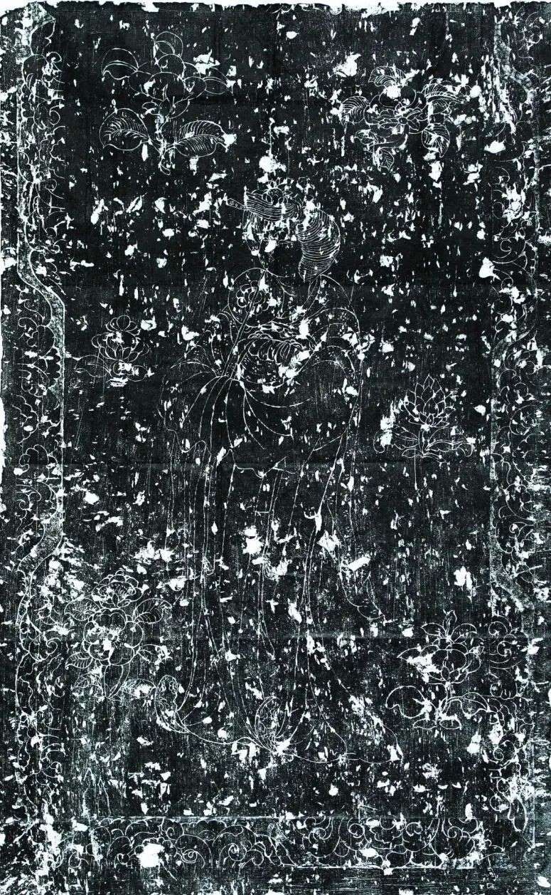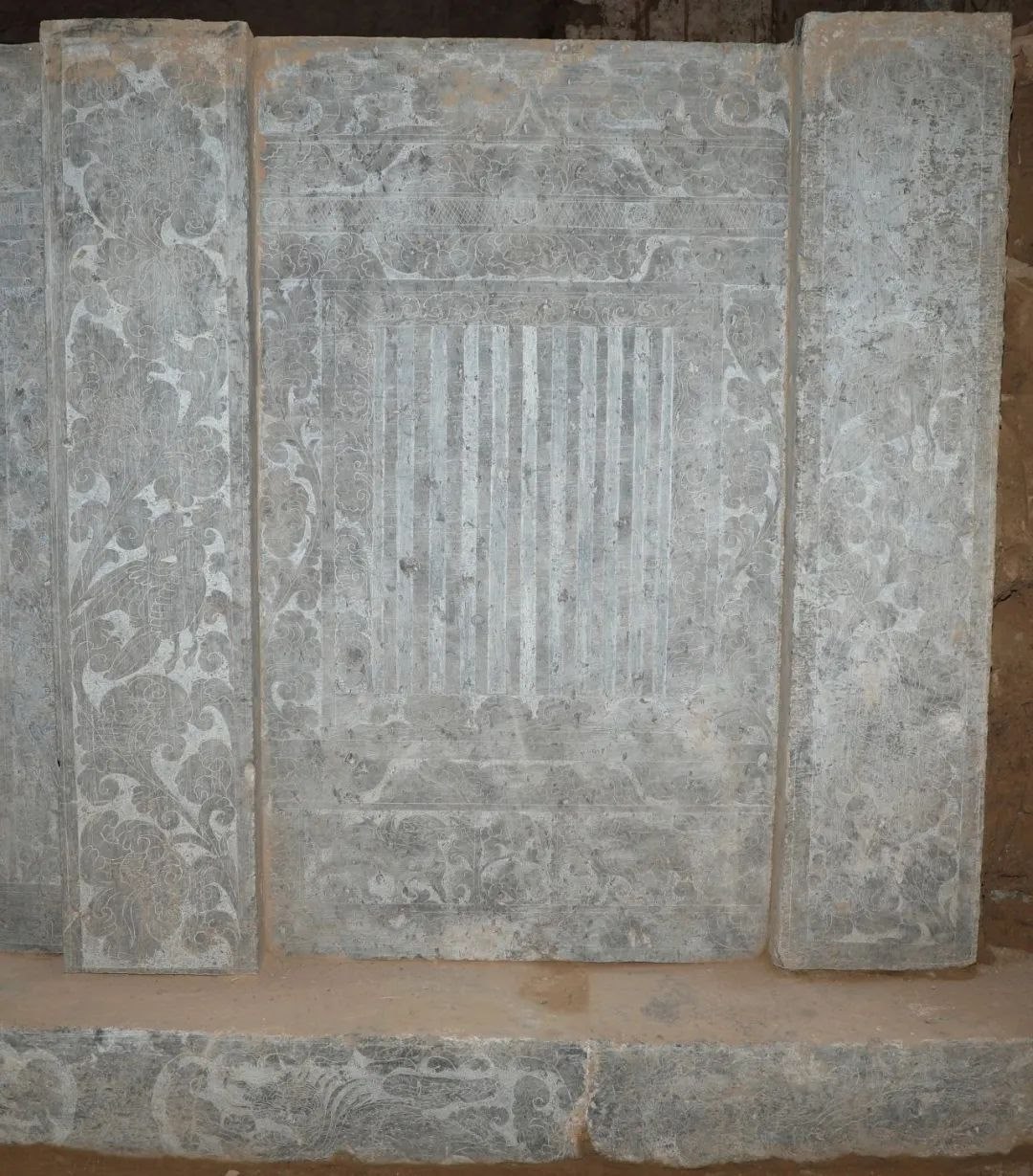 墓室西側(cè)發(fā)現(xiàn)石槨一具,保存較好。石槨面闊三間,進深兩間,頂部為廡殿式,僅一側(cè)雕刻有瓦棱;槨身由壁板和倚柱卯和而成,板壁外側(cè)雕刻門窗、卷云及神獸,內(nèi)側(cè)主體為侍女,周邊飾有花草等內(nèi)容;倚柱內(nèi)外均刻纏枝卷草花朵,部分穿插飛禽走獸;基座以七塊石板鋪成,立面間隔刻有壸門圖案,內(nèi)填奔獸圖樣。石槨線刻精細,畫面華麗而不繁縟,人物體態(tài)豐腴而不臃腫,充分體現(xiàn)出盛唐開元時期圖案靈動、富于想象的特征。