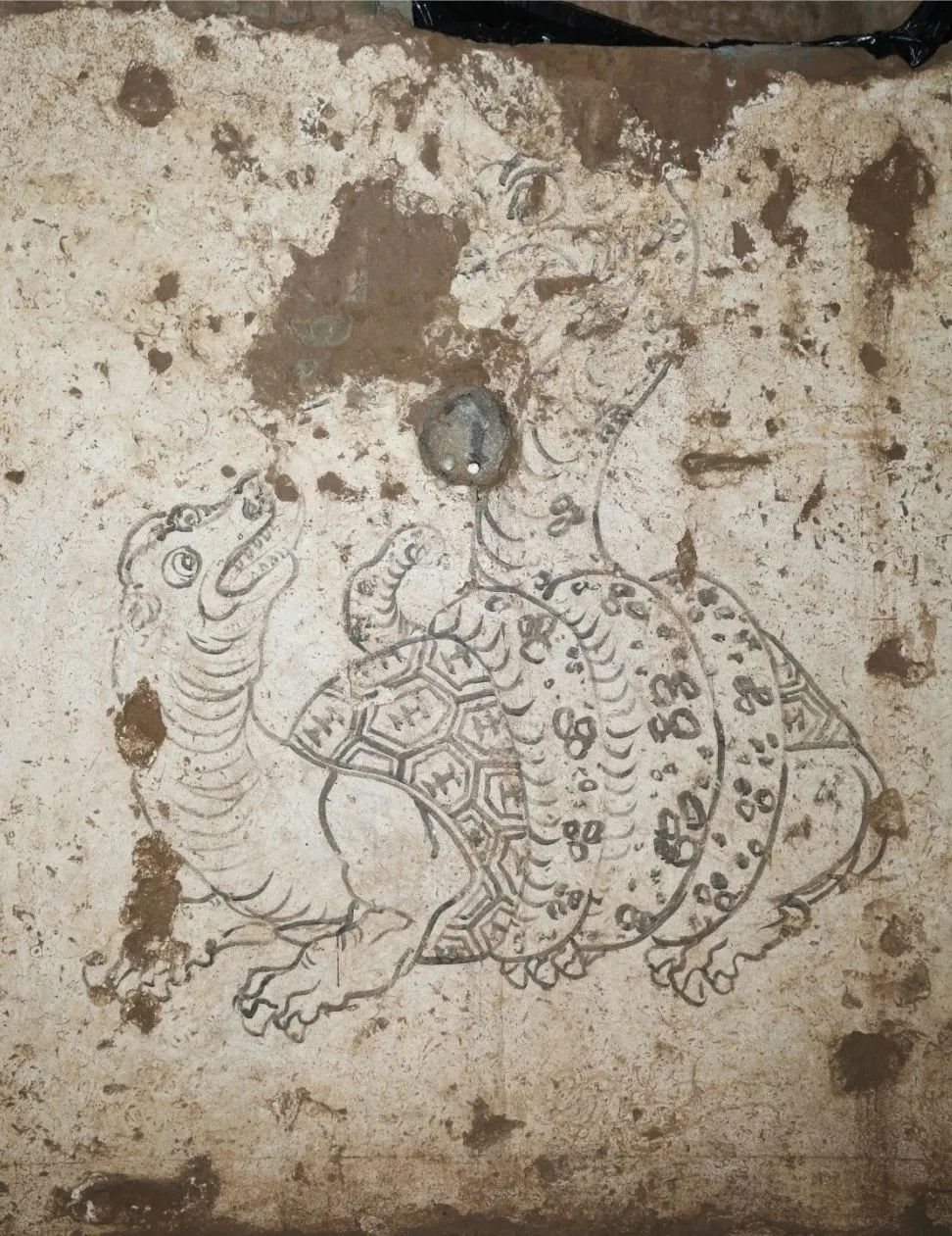 墓道處壁畫保存較差,僅墓道口處保留有少量畫面,兩壁分別為青龍、白虎圖樣;甬道兩側(cè)分別繪有三個侍女,僅存下半身;墓室東壁為樂舞圖,呈三段式布局,其中南側(cè)為十人組成的樂隊,中部為女舞者,北部為觀看的貴婦(應為墓主)及侍女;墓室北壁東側(cè)中心為一坐于方形高背扶手椅貴婦(應為墓主),兩側(cè)站立有侍女,應為表現(xiàn)墓主日常生活場景;墓室北壁西側(cè)為玄武圖,形象巨大,十分靈動;墓室西壁為六扇屏花草,畫面簡單且潦草;墓室南壁為朱雀,呈雙翅展開欲騰飛狀。該墓壁畫布局充實完整,畫面惟妙惟肖,內(nèi)容上有一定程度反映了墓主生前生活,體現(xiàn)出墓主情趣高雅,深居簡出,柔貞以靜好,有美婦之懿烈兼瞿母之慈仁。墓葬壁畫整體上風格及年代與讓皇帝李憲墓極為相近,或為共用一粉本所繪制。