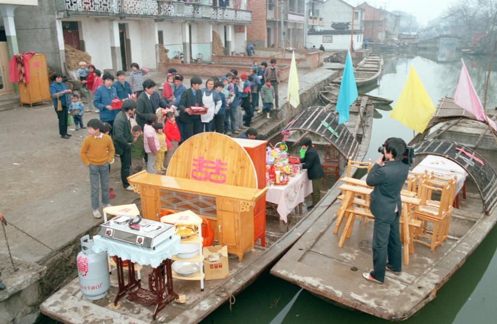 1990年春節(jié)前夕,紹興紅江村的章如花嫁到了一里外的檀瀆村。新郎迎娶新娘所用的交通工具,不是汽車(chē),也不是花轎,而是水鄉(xiāng)里常見(jiàn)的船。富裕起來(lái)的水鄉(xiāng)農(nóng)民在遵循傳統(tǒng)禮儀的同時(shí),也為婚禮增添了現(xiàn)代色彩。比如,陪嫁中少不得電視、煤氣罐;新娘少不得燙發(fā);另一件少不得的,是用攝像機(jī)記錄下婚禮的全部過(guò)程,作為一輩子的紀(jì)念。