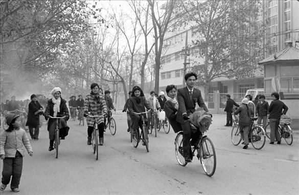 1990年春節(jié)期間,在陜西西安閻良區(qū),胸掛紅花的新郎用自行車(chē)馱著新娘經(jīng)過(guò)街頭。那個(gè)年代,用自行車(chē)接新娘曾經(jīng)一度成為流行的結(jié)婚方式。