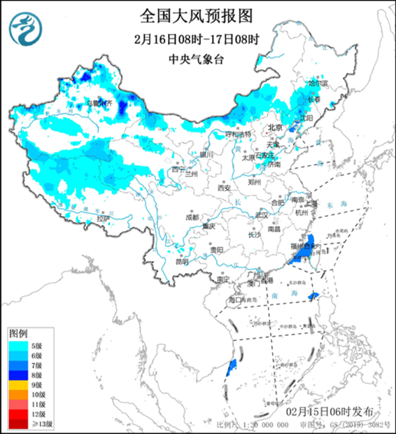 圖1 全國大風(fēng)預(yù)報圖(2月15日08時-16日08時)