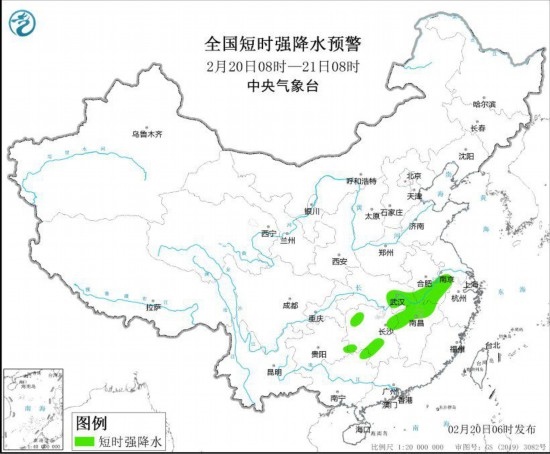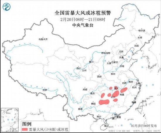 預計2月20日8時至21日8時,安徽西南部、湖北東部和南部、湖南中北部和西南部、江西中北部、貴州東南部、廣西東北部等地的局地將有8-10級雷暴大風或冰雹天氣;安徽中南部、江蘇西南部、湖北東部、湖南南部和西部、江西北部、廣西東北部等地的部分地區(qū)將有短時強降水天氣,最大小時雨量20-30毫米,局地可達35毫米以上。