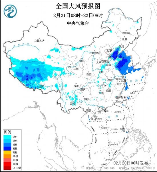 2月21日8時至22日8時,西藏中西部、青海中南部、華北東部、黃淮西部和東部、江淮西部等地的部分地區(qū)有5~6級風,陣風7~8級。渤海、渤海海峽、黃海大部海域將有7~8級,陣風9~10級的大風。