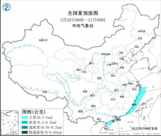 預計,20日白天至夜間,東海西部海域、浙閩沿岸海域、臺灣海峽、廣東沿岸海域、廣西沿岸海域將有大霧,能見度不足1公里。此外,20日早晨至上午,浙江東南部、廣東東南部等地將有大霧天氣,局地有能見度不足500米的濃霧。