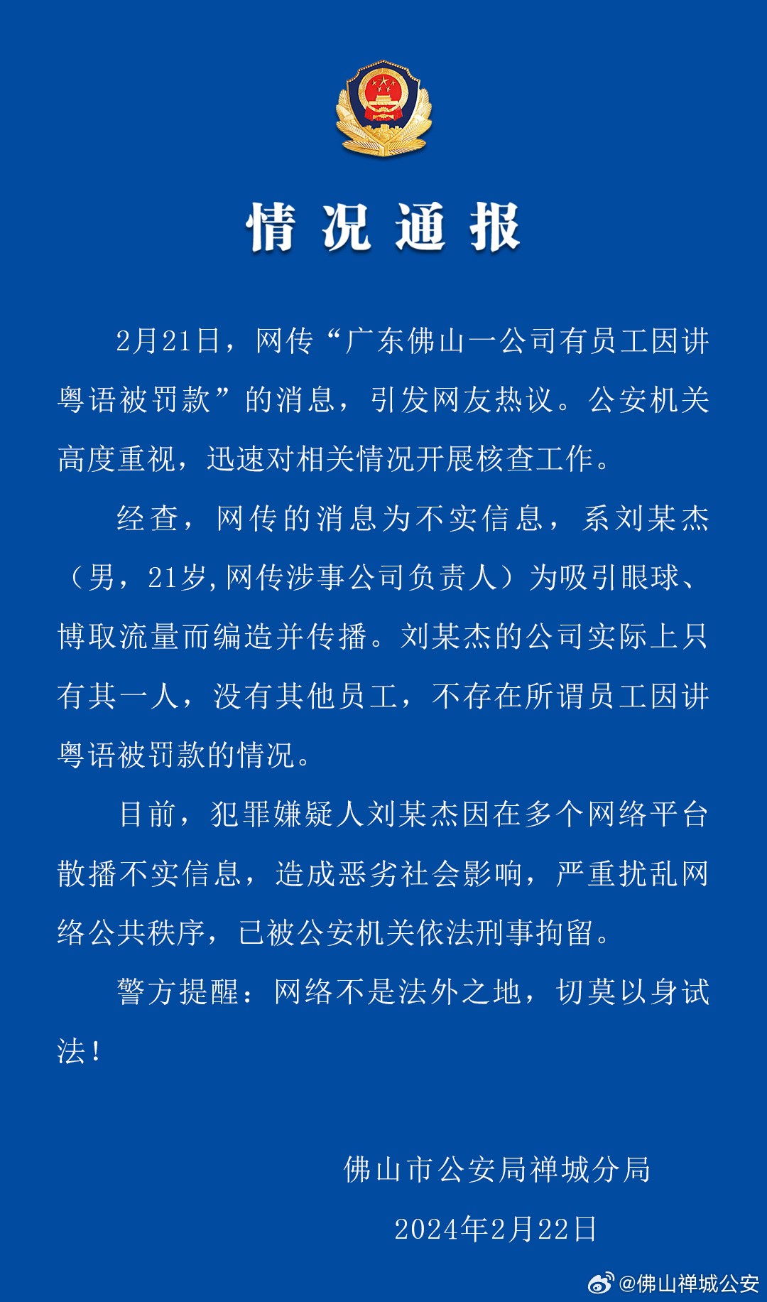 ·廣東佛山一公司有員工因講粵語被罰款?佛山警方:涉事者為吸引眼球編造謠言。