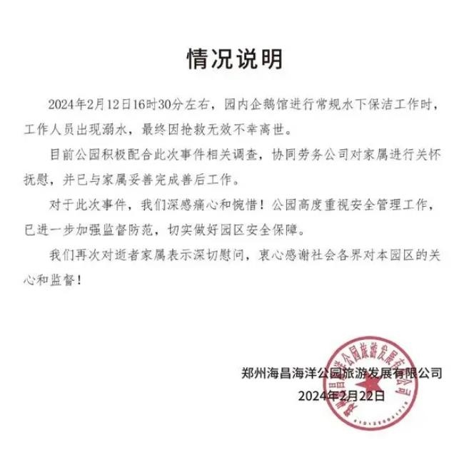 ·鄭州一海洋館潛水員在館內(nèi)溺亡,涉事公司發(fā)布情況說明:將積極配合事件調(diào)查,進一步加強安全監(jiān)督。