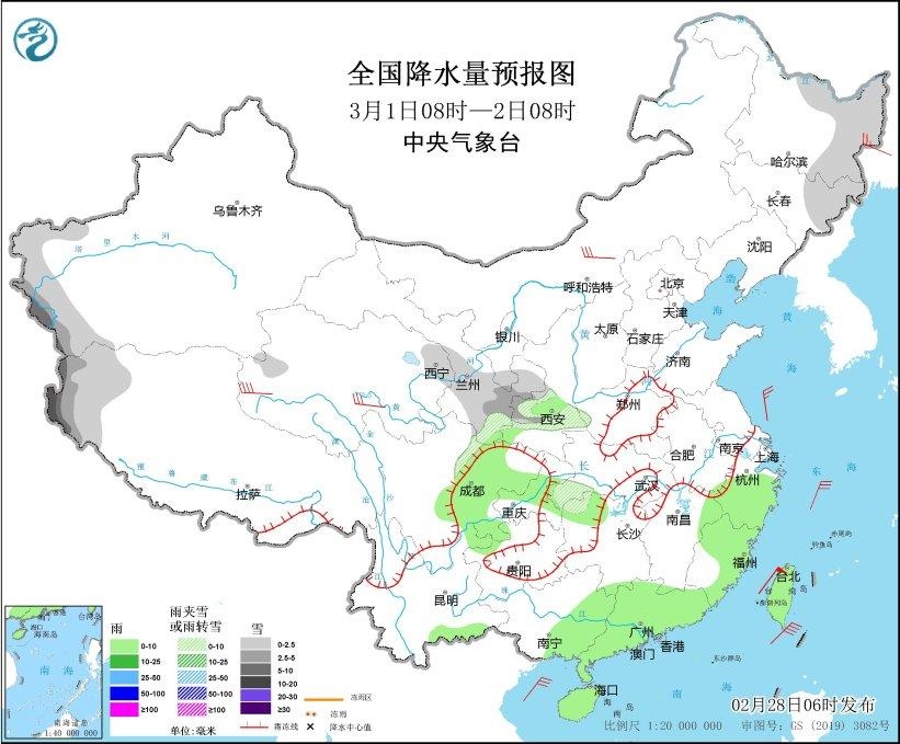 全國降水量預(yù)報圖(3月1日08時-2日08時)