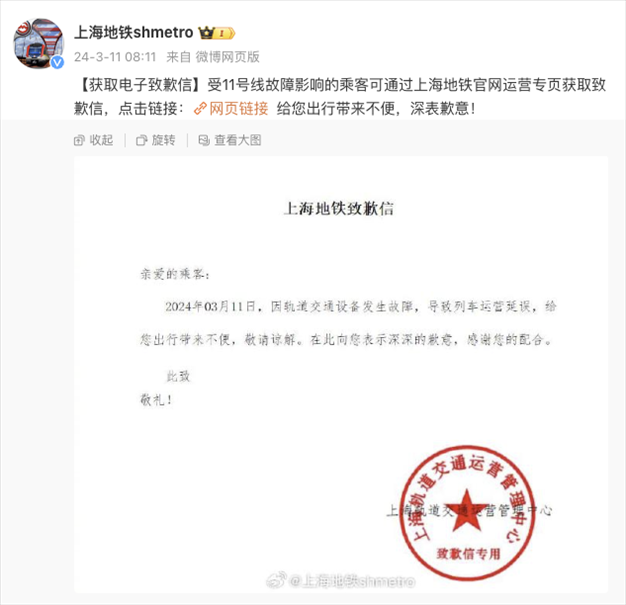 央視網(wǎng)消息:@上海地鐵shmetro 今早消息,上海地鐵今早消息,11號(hào)線因車輛故障,嘉定新城往武威路方向列車限速運(yùn)行,發(fā)車班次間隔延長(zhǎng),預(yù)計(jì)晚點(diǎn)15分鐘以上,請(qǐng)乘客們及時(shí)調(diào)整出行路徑,以免耽誤行程。隨后,上海地鐵官方向全體乘客發(fā)布致歉信表示歉意。目前,11號(hào)線運(yùn)營(yíng)已恢復(fù)正常。