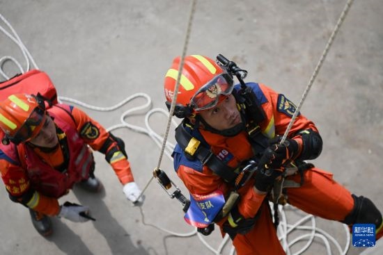 3月20日,消防員在演練現(xiàn)場(chǎng)進(jìn)行繩索攀爬。