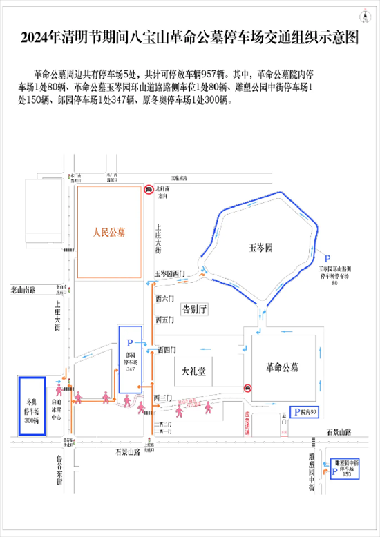 祭掃車輛可停放至公交停車場、老山南路路側(cè)停車場、雕塑公園西門停車場、原奧運(yùn)場站停車場。祭掃高峰日,上莊大街路側(cè)允許臨時(shí)停車。