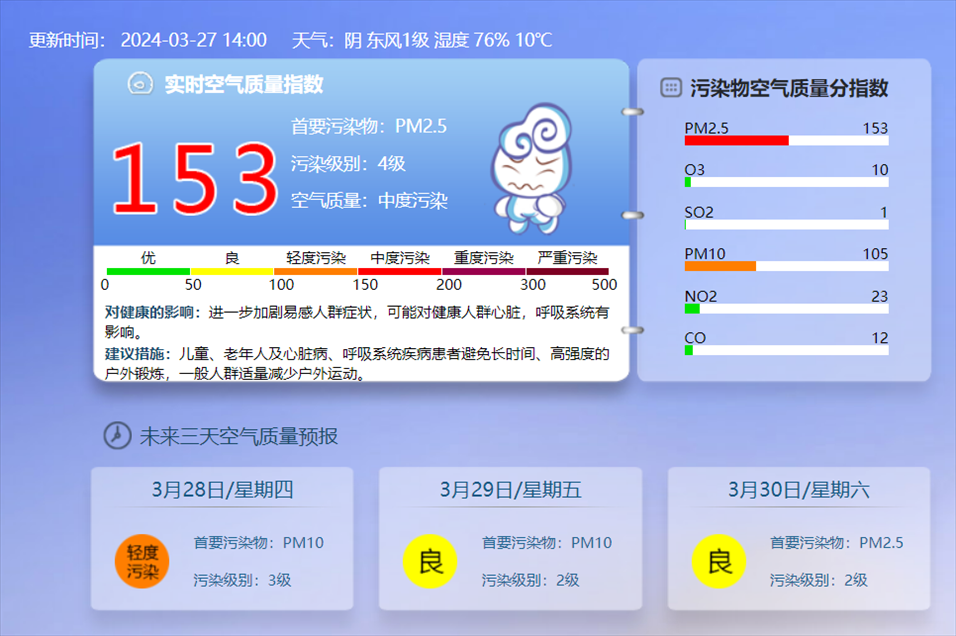 建議措施:兒童、老年人及心臟病、呼吸系統(tǒng)疾病患者避免長(zhǎng)時(shí)間、高強(qiáng)度的戶外鍛煉,一般人群適量減少戶外運(yùn)動(dòng)。