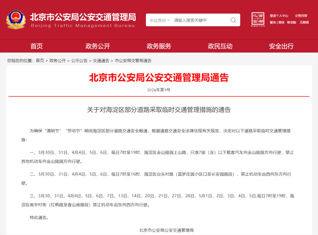 央視網(wǎng)消息:據(jù)北京市公安局公安交通管理局消息,3月26日,北京市交管局網(wǎng)站發(fā)布《關(guān)于對海淀區(qū)部分道路采取臨時交通管理措施的通告》,為確?!扒迕鞴?jié)”“勞動節(jié)”期間海淀區(qū)部分道路交通安全暢通,根據(jù)道路交通安全法律法規(guī)有關(guān)規(guī)定,決定對以下道路采取臨時交通管理措施。