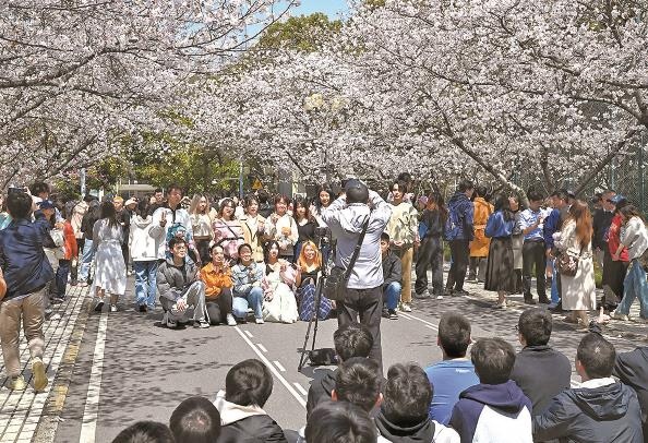 同濟大學(xué)櫻花園里賞櫻拍照的游人如織