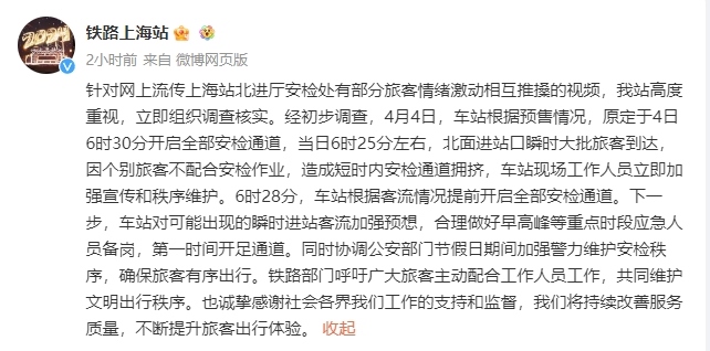 央視網(wǎng)消息:據(jù)@鐵路上海站 消息,針對網(wǎng)上流傳上海站北進廳安檢處有部分旅客情緒激動相互推搡的視頻,車站高度重視,立即組織調(diào)查核實。經(jīng)初步調(diào)查,4月4日,車站根據(jù)預售情況,原定于4日6時30分開啟全部安檢通道,當日6時25分左右,北面進站口瞬時大批旅客到達,因個別旅客不配合安檢作業(yè),造成短時內(nèi)安檢通道擁擠,車站現(xiàn)場工作人員立即加強宣傳和秩序維護。6時28分,車站根據(jù)客流情況提前開啟全部安檢通道。下一步,車站對可能出現(xiàn)的瞬時進站客流加強預想,合理做好早高峰等重點時段應急人員備崗,第一時間開足通道。同時協(xié)調(diào)公安部門節(jié)假日期間加強警力維護安檢秩序,確保旅客有序出行。鐵路部門呼吁廣大旅客主動配合工作人員工作,共同維護文明出行秩序,也誠摯感謝社會各界對其工作的支持和監(jiān)督,將持續(xù)改善服務質(zhì)量,不斷提升旅客出行體驗。