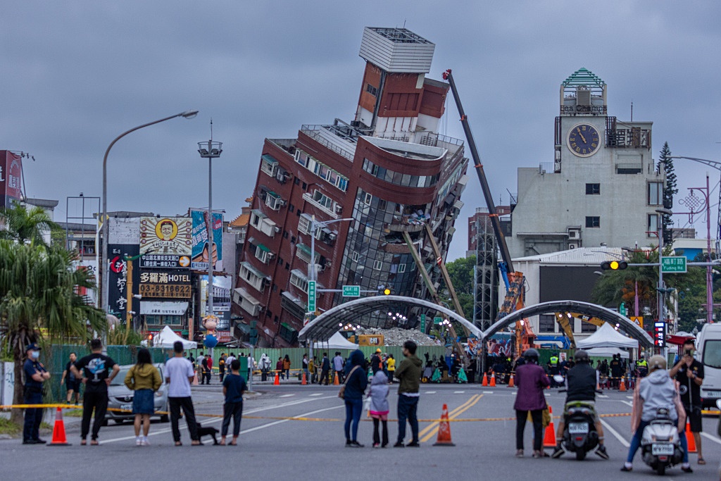 2024年4月5日,臺(tái)灣花蓮縣海域發(fā)生7.3級(jí)地震后,傾斜倒塌的建筑物正在被拆除。視覺(jué)中國(guó) 圖