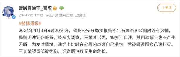 央視網(wǎng)消息:據(jù)@警民直通車_普陀 微博消息,4月9日8時20分許,上海普陀公安分局接報警稱:石泉路某公廁附近有火情,民警迅速到場處置。經(jīng)初步調查,王某某(男,16歲)自述,其因瑣事與家長產(chǎn)生矛盾,為發(fā)泄情緒,途經(jīng)上址時在公廁內點燃自己書包,后被附近群眾迅速撲滅。王某某頸背部被灼傷,經(jīng)送醫(yī)治療無生命危險。