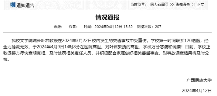 央視網(wǎng)消息:據(jù)廣西民族大學(xué)網(wǎng)站消息,廣西民族大學(xué)4月12日發(fā)布情況通報(bào),該校文學(xué)院院長(zhǎng)葉君教授在2024年3月22日校內(nèi)發(fā)生的交通事故中受重傷,學(xué)校第一時(shí)間聯(lián)系120送醫(yī),經(jīng)全力搶救無(wú)效,于2024年4月9日14時(shí)8分在醫(yī)院離世。對(duì)葉君教授的離世,學(xué)校萬(wàn)分悲痛和惋惜!目前,學(xué)校正敦促警方盡快查明真相、及時(shí)處罰相關(guān)責(zé)任人員,并積極配合家屬做好相關(guān)善后事宜,對(duì)事故調(diào)查結(jié)果將及時(shí)公布。