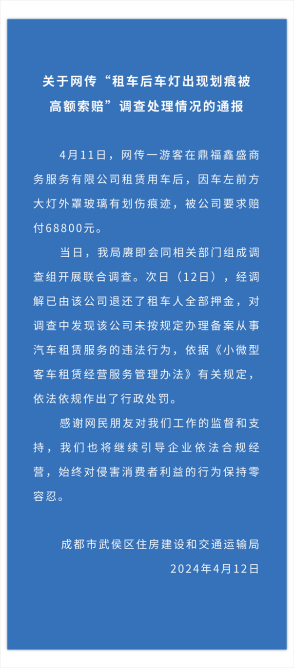 ·官方通報男子在成都遭遇“提燈驗車”:已退還押金,涉事租車公司被行政處罰。