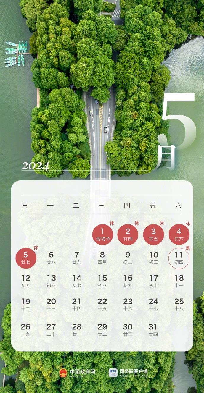 根據(jù)國務(wù)院辦公廳通知精神,2024年勞動(dòng)節(jié)放假安排為:5月1日(星期三)至5月5日(星期日)放假調(diào)休,共5天。4月28日(星期日)、5月11日(星期六)上班。