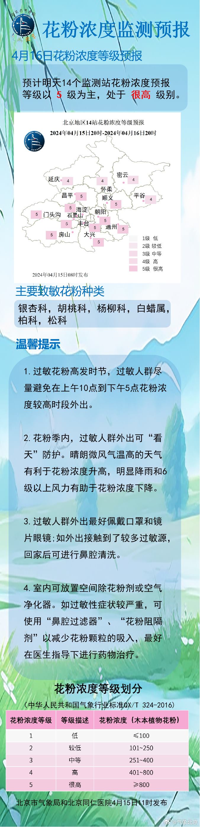 央視網(wǎng)消息:@?氣象北京 發(fā)布花粉實況及花粉濃度預(yù)報,昨日(4月14日)北京6站大部花粉濃度等級為4級。目前本市主要致敏花粉種類為銀杏科、胡桃科、楊柳科,白蠟屬,柏科,松科等。預(yù)計4月15日14站花粉濃度以5級為主,為很高級別(>800)。今天有大風(fēng)沙塵天氣,大部分地區(qū)花粉濃度為很高級別,敏感人群外出需注意做好健康防護。