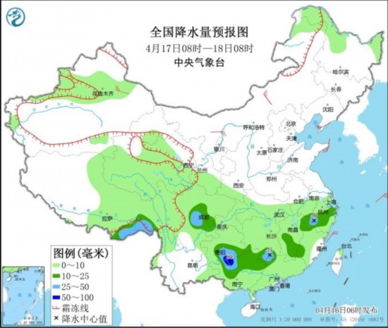 全國降水量預(yù)報圖(4月16日08時-17日08時)