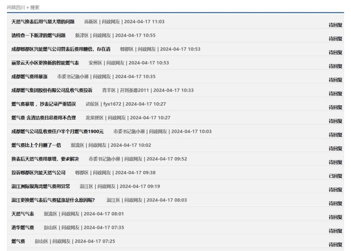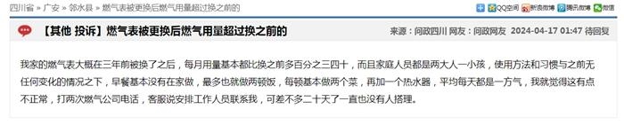 中新網(wǎng)4月17日電(中新財經(jīng)記者 吳濤)近日,在“問政四川”平臺上,不少網(wǎng)友反映“更換新表后燃?xì)赓M(fèi)異常上漲”,這些留言顯示來自四川成都、自貢、廣安、南充等多地,僅僅在4月16日,保守估計就有十幾條;17日上午又出現(xiàn)十幾條。大部分尚未得到回復(fù),部分獲得官方回復(fù)稱“留言已轉(zhuǎn)交給相關(guān)機(jī)構(gòu)進(jìn)行處理”。