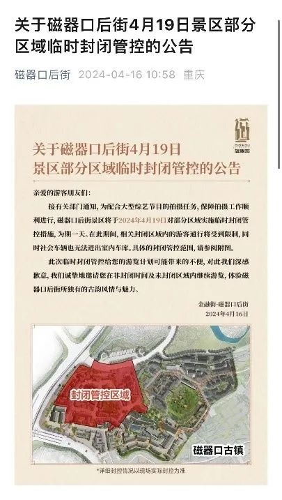 根據(jù)磁器口后街景區(qū)發(fā)布的公告,為配合大型綜藝節(jié)目的拍攝任務(wù),保障拍攝工作順利進(jìn)行,磁器口后街景區(qū)于4月19日對部分區(qū)域?qū)嵤┡R時封閉管控措施,為期一天。該景區(qū)后續(xù)發(fā)布視頻也顯示,當(dāng)天確實(shí)為綜藝節(jié)目《奔跑吧》借地錄制。