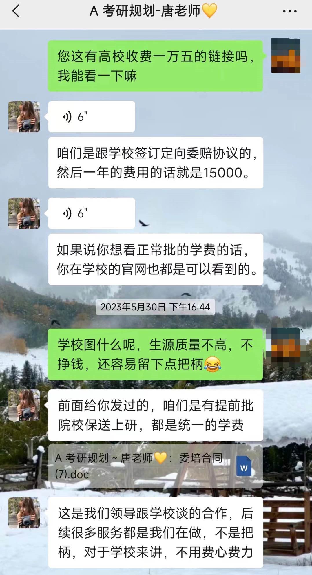 陳鑫說(shuō),對(duì)方得知他計(jì)劃報(bào)考中央財(cái)經(jīng)大學(xué)非全日制MBA后,還表示機(jī)構(gòu)可以提供學(xué)費(fèi)優(yōu)惠,一般MBA的學(xué)費(fèi)大概是20萬(wàn)左右,但該機(jī)構(gòu)的招生老師說(shuō)他們和中央財(cái)經(jīng)大學(xué)、對(duì)外經(jīng)貿(mào)大學(xué)、北京工商大學(xué)三所大學(xué)的非全日制工商管理專業(yè)都有渠道合作,不僅可以保證筆試、面試通過(guò),還可以幫他走定向委培協(xié)議,這樣學(xué)費(fèi)就只需要15000元一年。